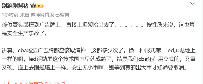 赛后媒体人“别跑刚背猪”表示,赖俊豪头部撞到广告牌上,直接上担架抬出去了,按性质来说,这也算是安全生产事故了。讲真,cba场边广告牌都应该取消掉,这都多少次了。换一种形式嘛,led屏贴地上一样的啊,led踩踏屏这个技术国内早就成熟了,结果我们cba还在用立式的,又重又硬,撞上去跟撞墙上一样。安全无小事啊,别等到真的出大事才知道要取消。